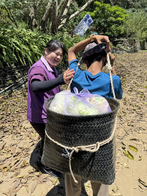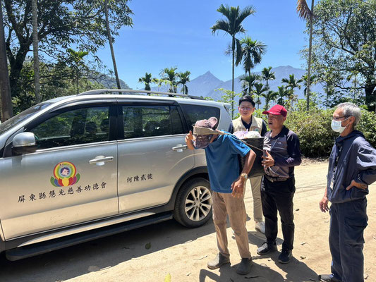 當我們好不容易到達臨停點,就看到遠遠兩、三個黑點在移動,等靠近時才看清楚那是前來背物資回去的部落居民,當他們抵達後看見我們帶來的生鮮食材臉上笑容就沒停過,不斷用族語對我們述說著感謝和祝福。且適逢父親節我們也準備善心人士提供的蛋糕,讓受困在裡面居民也能一同過節。
