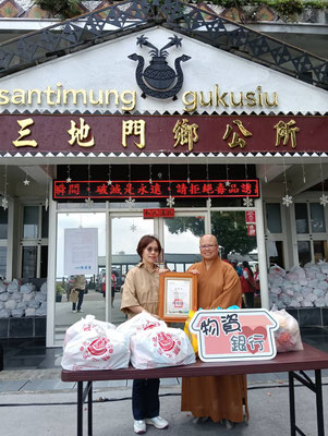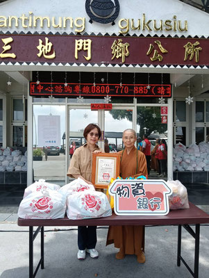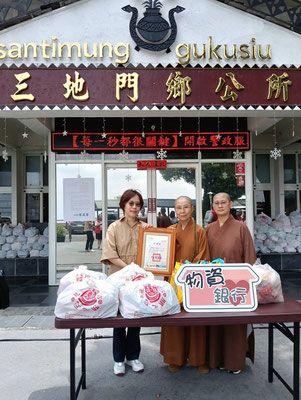 準備妥當後創會理事長 釋圓通法師、理事長 釋眾慈法師、理事 釋眾慧法師率領工作同仁,於星期二送往各鄉公所,縣政府並在三地門鄉公所舉辦捐贈儀式,由社會處處長 劉美淑致贈感謝狀,三地門鄉鄉長 曾有欽致贈感謝禮品,處長和鄉長感謝本會的協助,讓災民們感受到來自社會大眾的關懷,且鄉公所社會課呂課長也表示楊柳颱風即將到來會盡快將物資發送給受災戶備災。